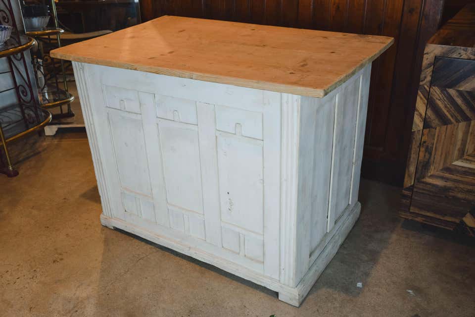 This wonderful antique shop counter/desk has a light three plank pine top and an antique painted finish on the bottom. The counter, finished on all sides has one long drawer, divided into two compartments on the inside that spans the width of the desk with two smaller drawers on each pedestal. The drawers all open to one side while the other three sides have a molded paneling. The scalloped detail at the opening for a chair adds to the charm of the piece. At the moment, the drawers have rope pulls, however new pulls could easily be added. No keys.