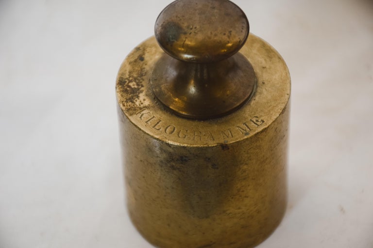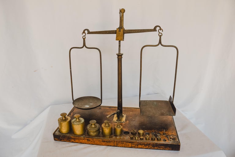 This equal arm brass scale is set on a wooden platform with brass weights. The wooden platform has circular cutouts for the weights This piece is functional and beautifully. The wood shows the marks of a scale that was used often in mercantile trade. This beautiful scale would be perfect in a study bookshelf or a decorative item on any table.