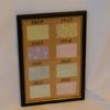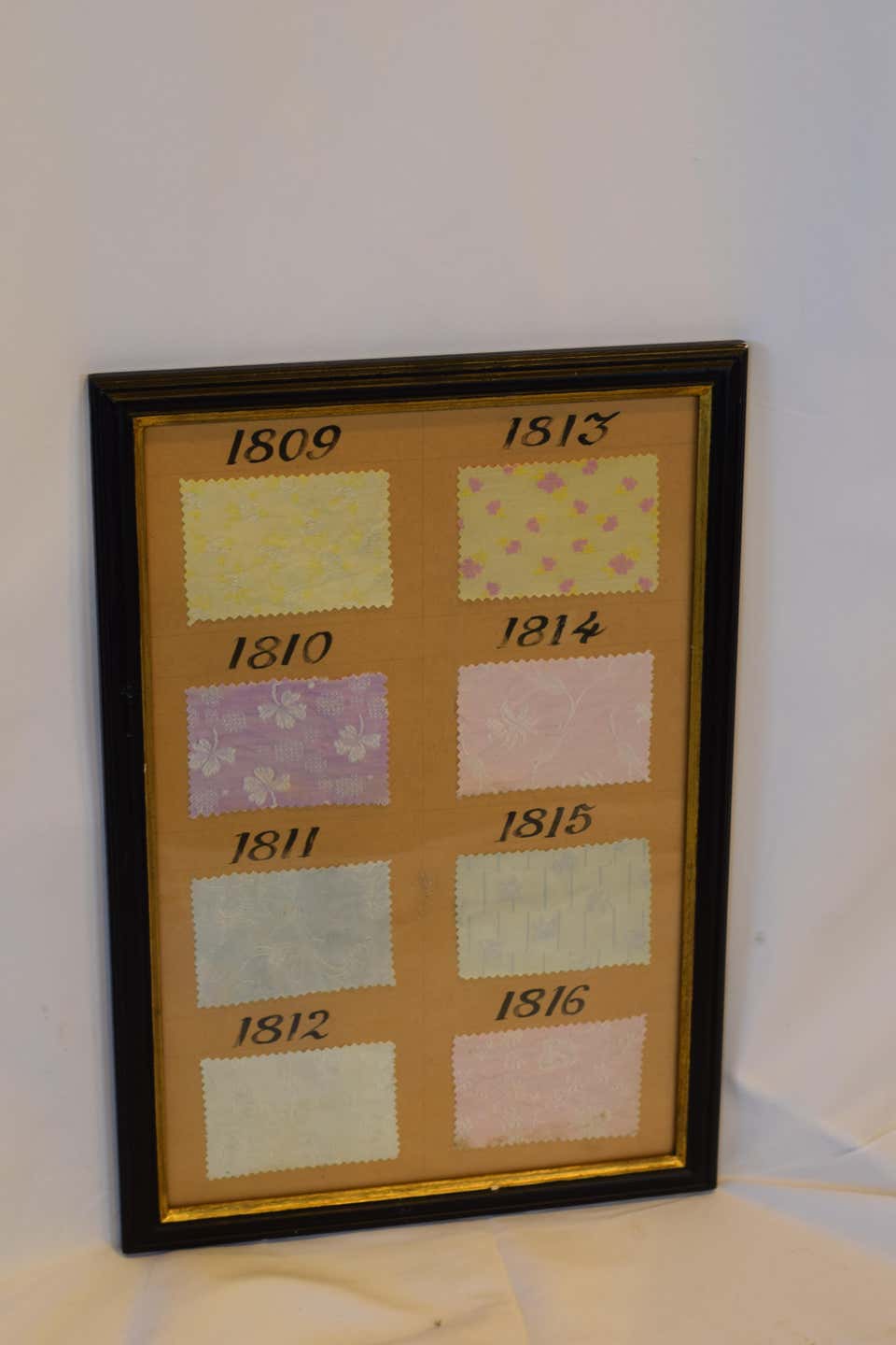 Charming framed vintage French fabric sample sheet from a shop sample book numbered with beautiful calligraphy script.